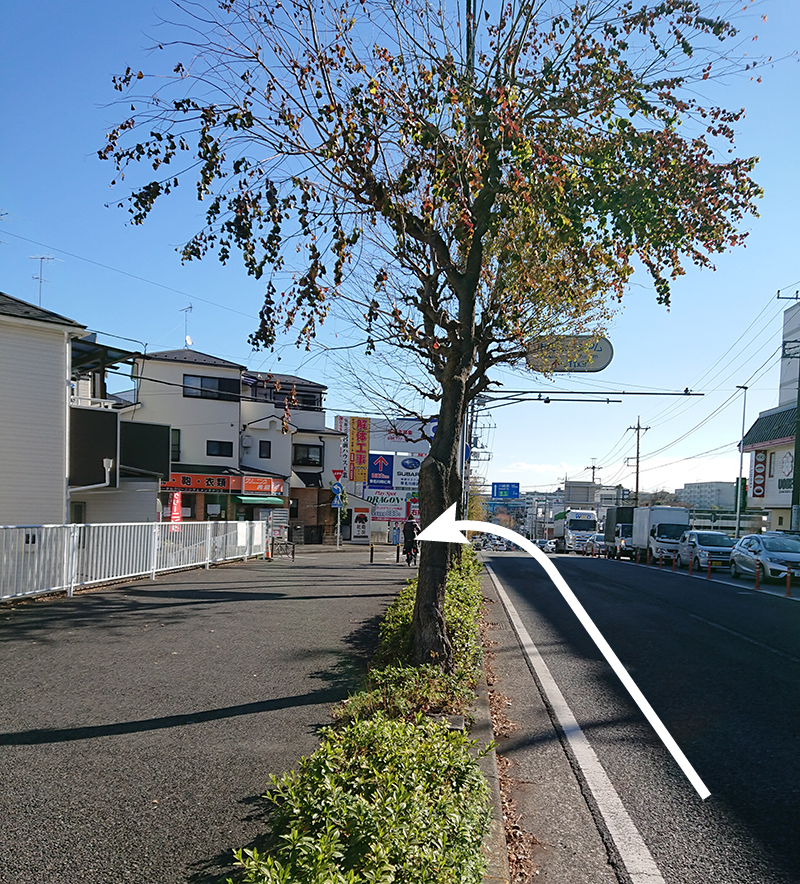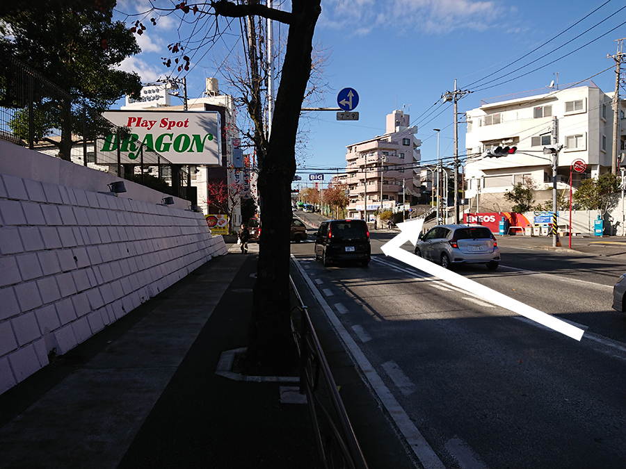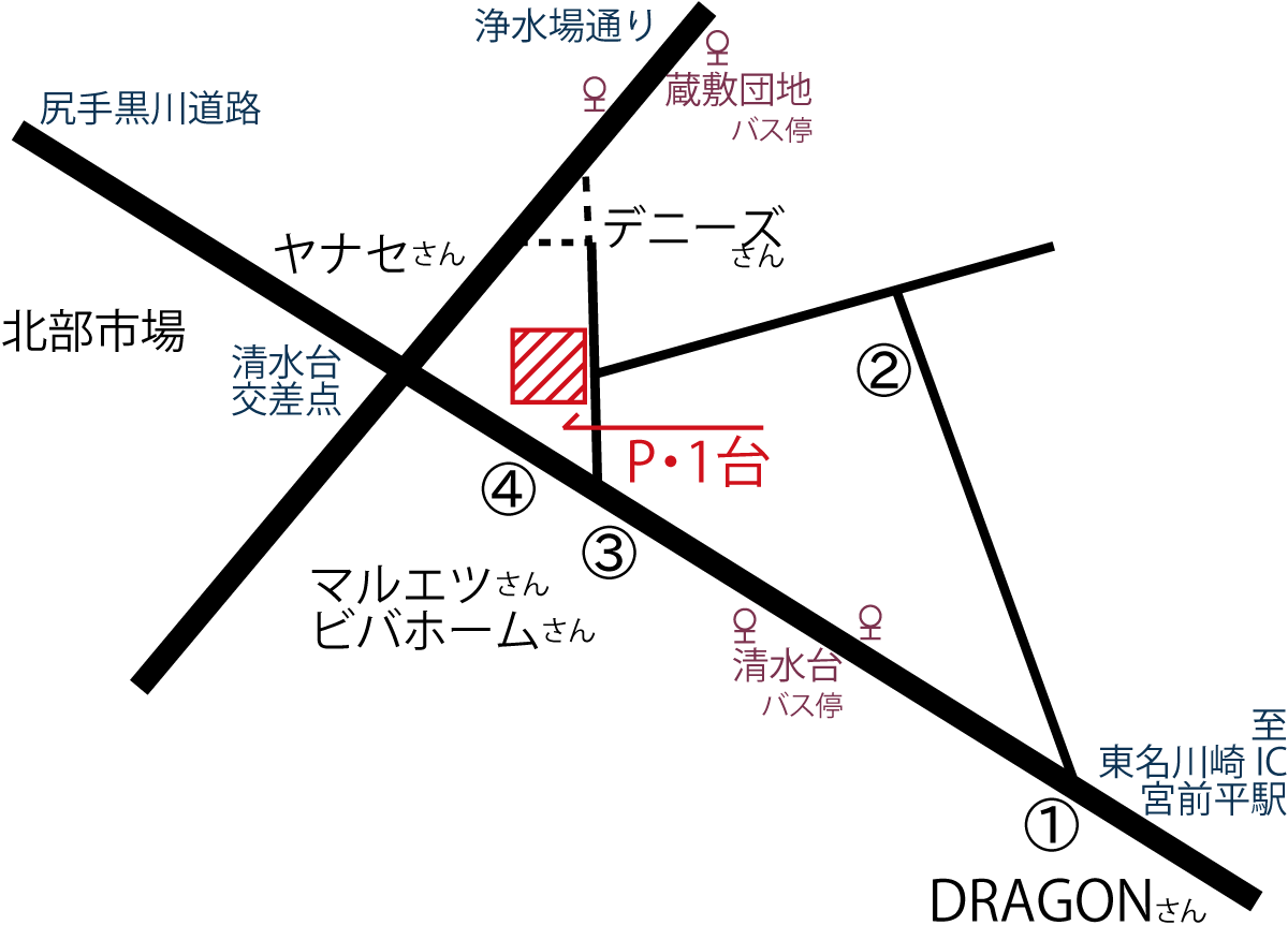 宮前平駅や東名川崎IC方面からお越しの際は、清水台交差点の前、「DRAGON」さんと「エネオス」さんを目印に右折して下さい。